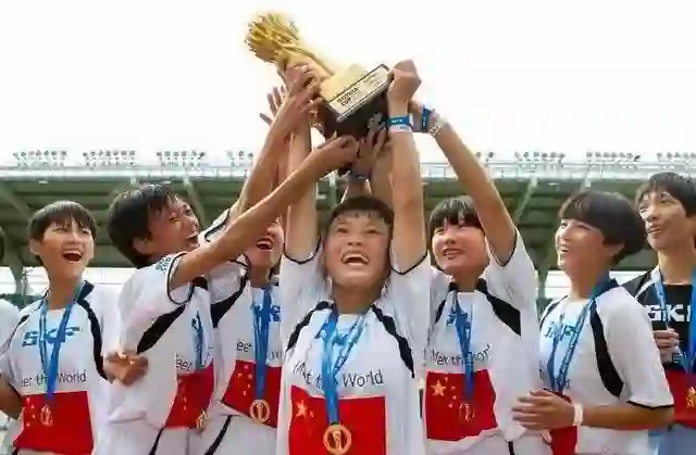 在2015年“哥德堡杯”世界青少年足球锦标赛U12女子组的决赛中,琼中女足战胜瑞典阿卡德米女足夺冠,姑娘们捧起奖杯庆祝。图 | 网络