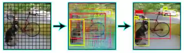 YOLO 是当前深度学习领域解决图像检测问题最先进的实时系统。如下图所示,YOLO 首先将图像划分为规定的边界框,然后对所有边界框并行运行识别算法,来确定物体所属的类别。确定类别之后,yolo 继续智能地合并这些边界框,在物体周围形成最优边界框。