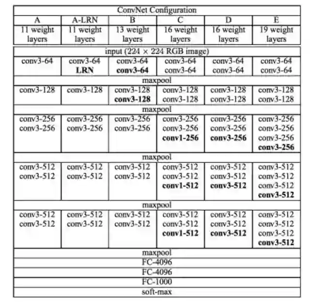 如上图所示,VGG 包含池化层之后的卷积层,池化层负责使层变窄。他们在论文中提出多个此类网络,不同之处在于架构深度的变化。