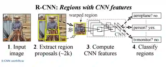 基于区域的 CNN 架构据说是所有深度学习架构中对目标检测问题最有影响力的架构。为了解决检测问题,RCNN 尝试在图像中所有物体上画出边界框,然后识别图像中的物体。工作原理如下: