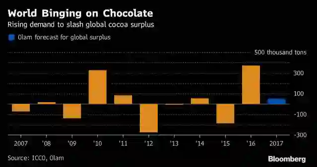 2016年,随着可可产量大增(科特迪瓦的产量创下新记录,排名第二的生产国加纳也大获丰收),伦敦交易的基准可可期货暴跌了23%,创下了2011年以来的最大跌幅。据总部位于阿比让的国际可可组织(International Cocoa Organization)估算,这些非洲国家的丰收将全球生产盈余推高至了37.1万吨。