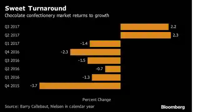 较低的成本正在推高需求,全球最大的可可加工商百乐嘉利宝公司(Barry Callebaut AG)在11月早些时候引述分析公司尼尔森(Nielsen)的数据称,在截至2017年6月的三个月里,全球巧克力糖果市场增长了2.3%,接下来的三个月增长了2.2%。此次反弹前,该市场已经历了至少连续6个季度的萎缩。成长被低估