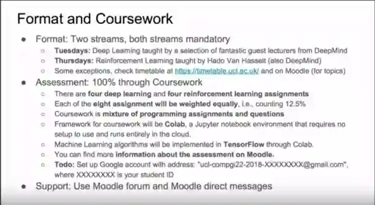 该课程分为两大部分,第一部分是深度神经网络的机器学习,另一部分是利用强化学习进行预测和控制,在研究深度强化学习的过程中,这两个部分将串联在一起,深度神经网络在强化学习环境中被训练成函数逼近器。