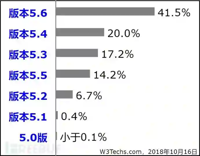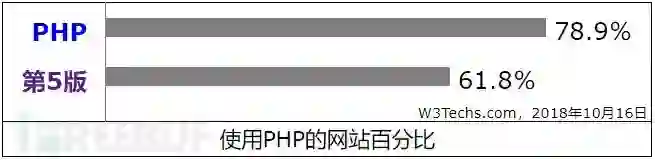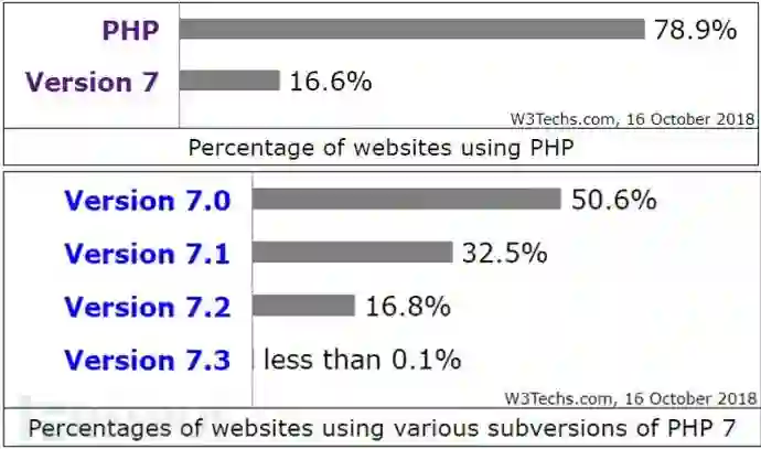 根据 W3Techs 最新的统计数据,在已知的语言中,有78.9%的网站采用了 PHP,全球所有的网站中使用 PHP 5 版本的网站占比高达 61.8%。再细分下来,使用PHP 5的网站中有 41.5% 采用的是 PHP 5.6,也就是说依然有很多网站仍然采用不再受支持的 PHP 版本。