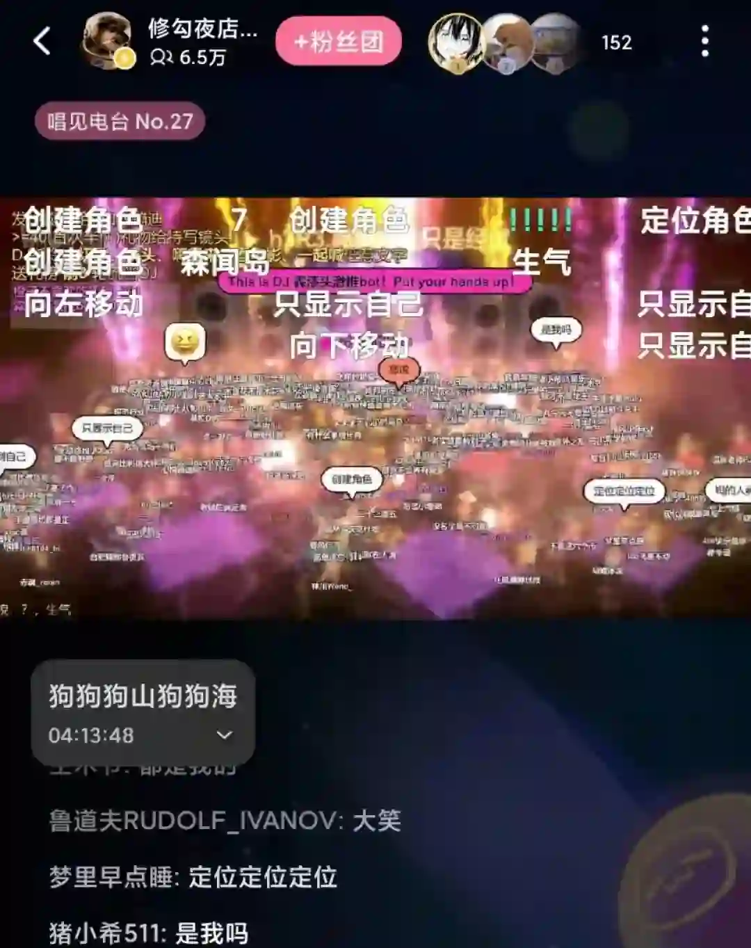 打开B站的直播页面,搜索“修勾夜店”,每天夜里,数万人化身小狗“cheems”在舞池中摇摆,只要在弹幕中发布“移动、停下、大哭”等指令,你的修勾就能做出相应的举动,而财大气粗的打赏玩家更能登上DJ台,一条“一起喊任意文字”指令发布,你就能体会一把“全场买单”的极致快感。