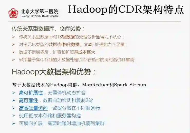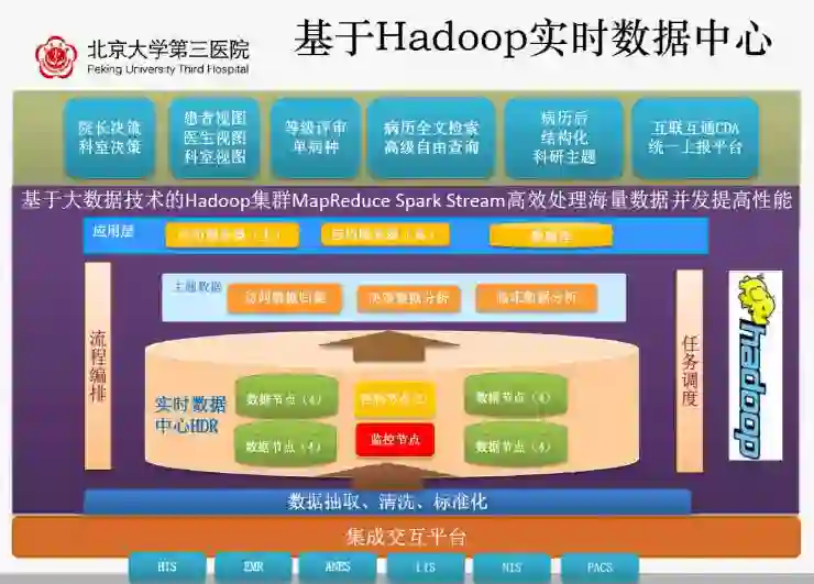 因为其他传统型数据中心不能够满足这种大数据的处理,北京大学第三医院也第一次尝试在医疗、医院建立基于Hadoop这种大数据技术的实时数据中心,通过集中平台实时传送存储数据中心。至于为何选择Hadoop,主要出于它可高效处理海量数据。