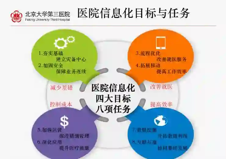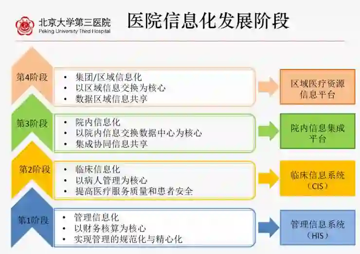 第一个阶段就是管理信息化(HIS),北京大学第三医院1998年做HIS,而在一年后就做了CIS。这些都是以病人为中心,代表EMR电子病例为核心的临床信息化,为患者服务来提高医疗质量和患者的安全。