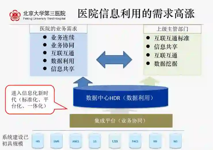 以北大第三医院为例,各部门和业务之间的协同、数据的互联互通、整体的数据挖掘应用,这么多底层系统到底该怎么做?