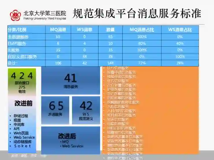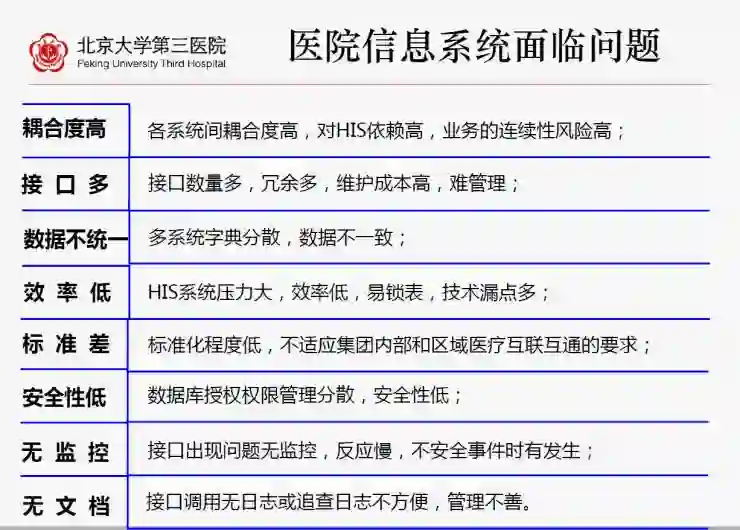 北京大学第三医院梳理了424个接口,发现只有275个是有效的。因为上线将近20年,很多无效的接口还残存着,通过数据接口,其实那些可以不用的,通过上线很多接口都停掉了。