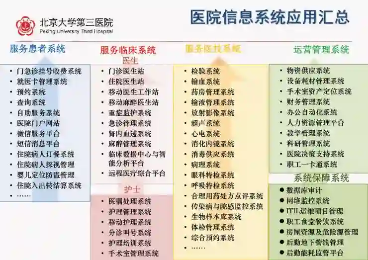 通常情况下,医院信息系统应用可汇总为四大主线:服务患者系统、服务临床系统、服务医技系统、运营管理系统。