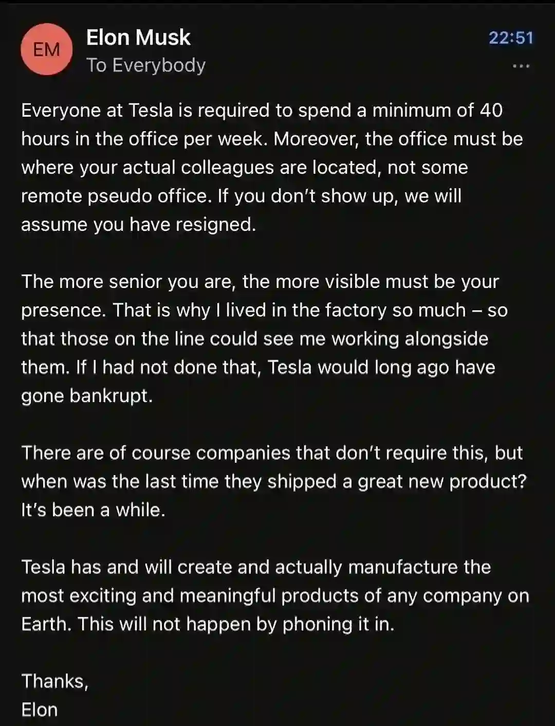 就在本周,马斯克本人也发送了两封电子邮件给员工,要求“特斯拉员工必须每周至少在办公室工作 40 小时”,“如果你不出现,我们将默认你已经辞职。”