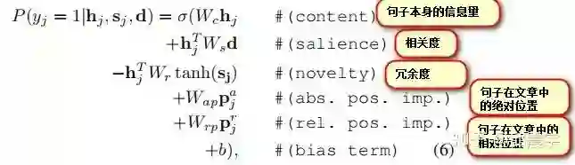 可以看到,它从多个不同维度去建模一个摘要句的特征,包括之前说的相关度和冗余度,除此之外还有句子本身包含的信息量,句子在文章中的位置(通常来说文章开头的句子是摘要句的可能性比较大)等。