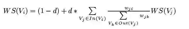 其中, 表示节点i和j之间的边权重,即两个句子之间的相似度。默认任意两个句子都是相连的。假设当前i=1,j=2,等式右侧第二部分中,分母表示句子2与所有句子的相似度的和,分子表示句子1与句子2的相似度,再乘上句子2的权重,得到句子2的一个分数。最后对于所有与句子1相连的句子j求和,得到所有的分数之和。