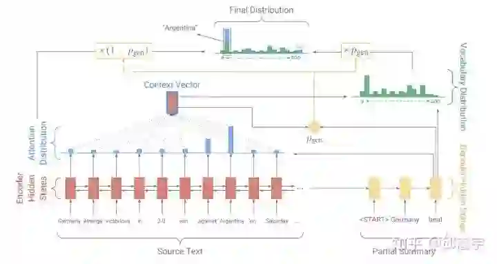 同时在模型中设计一个 ,表示最终使用的模型输出是否使用decoder生成的词的概率。如上图所示,encoder的attention生成的alignment会参与到最后decoder输出词分布的计算中。