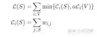 其中,S表示候选摘要集。L(S)度量覆盖率,而R(S)用于奖励多样性。这里并没有使用传统的做法去惩罚多样性,是因为冗余惩罚(在函数中,对冗余度进行惩罚,需要减去冗余分数)破坏了目标函数的单调性。L(S)和R(S)的函数定义分别如下所示: