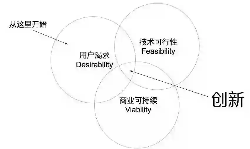 IDEO 这张很经典的图把「创新」定义为用户渴求、技术可行性和商业可持续的交集。一个成功的创新应该三者兼顾。