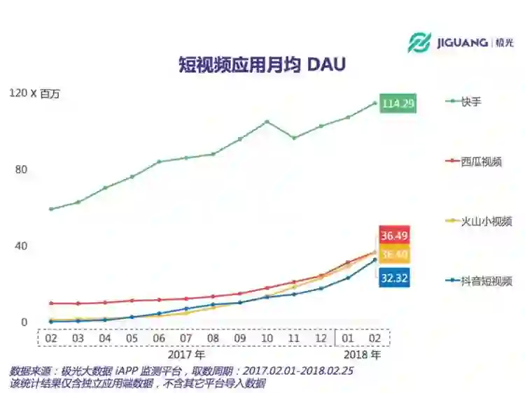 不过从数据上看,过去一年抖音的增长并未给快手带来威胁——根据QuestMobile的数据,2017年到2018年春节,快手的日均活跃用户在4000万的基础上增加了7000多万,抖音则是从0增加到6000万。今日头条旗下西瓜视频、火山小视频和抖音的日均活跃用户加起来,才能和快手相当。