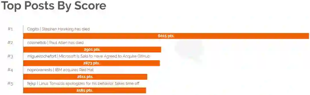 除了上面提到的这些数据,官方还展示了不少关于用户个人的排名数据,这里不作详细介绍,感兴趣的可复制链接进行查看 >>> https://chart.ly/stories/hacker-news-2018。