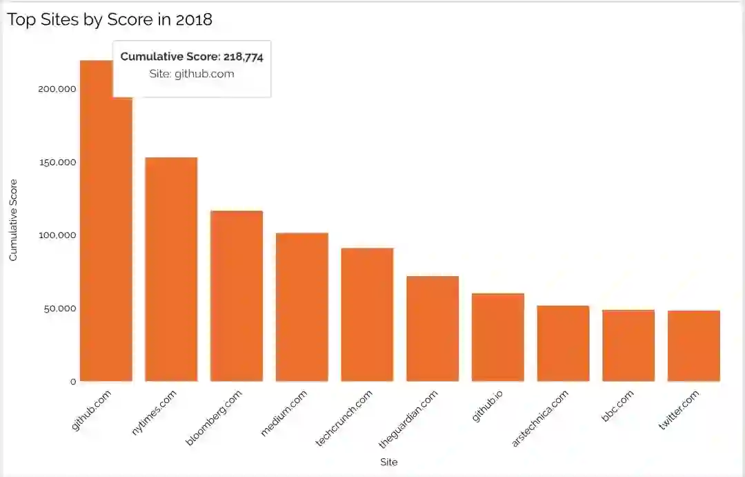 Hacker News 将全球大量的开发者聚集到了一起,理所当然的,github.com 自然会与 Hacker News 有着密不可分的关系。据统计,若按分数排行,github.com 以 218774 的得分成为 HN 上最受欢迎的网站,其次分别是纽约时报和彭博社。