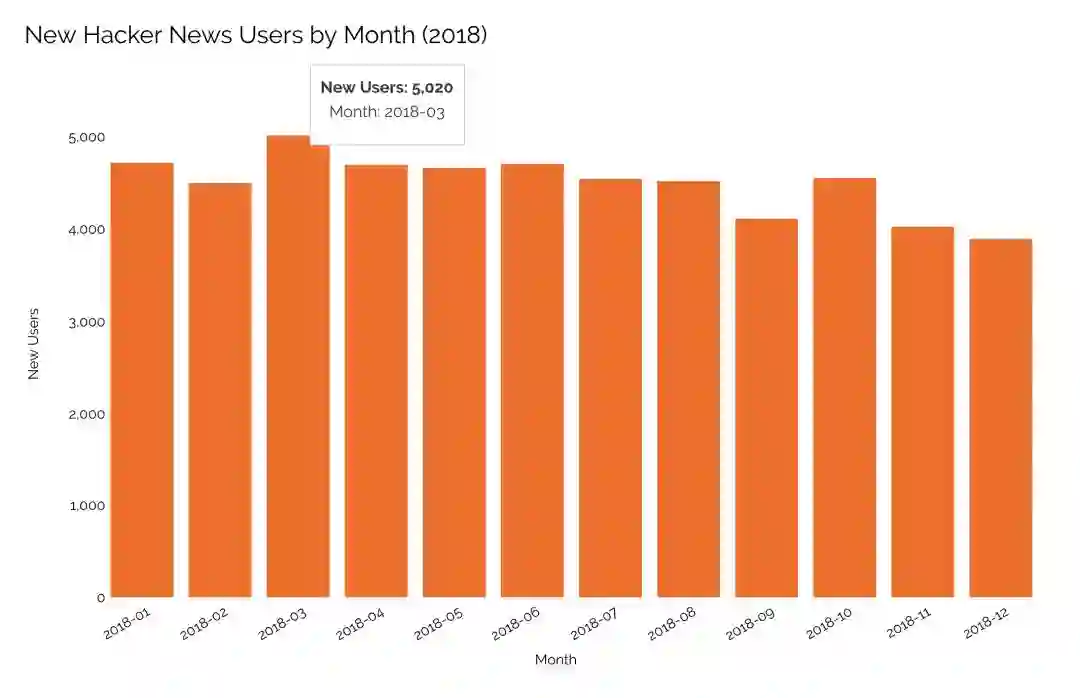 官方表示,Hacker News 在 2018 年产生了超过 250 万个帖子,讨论了 30 多万个不同的主题,新增了 5 万多名新用户,而用户贡献的评论也高达 220 多万。