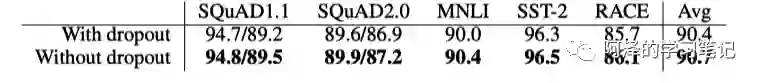另外加入 dropout 后会增加很多临时变量,删掉 dropout 后可以提升内存的利用率。此外 ALBERT 还加了十倍的数据量= =: