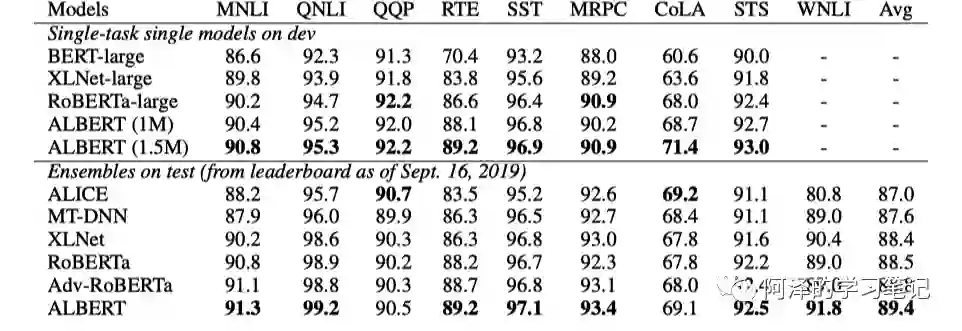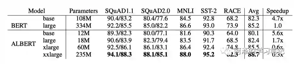 最终 ALBERT 比 BERT-large 参数更少,效果更好,并在多个 NLP 任务中刷榜。