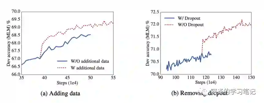 下图为去掉 dropout 前后的精度。这里解释一下:dropout 对于防止过拟合来说具有非常好的效果,但是对于 Masked Language Model 来说,其学习本身就比较困难,所以不用担心过拟合):