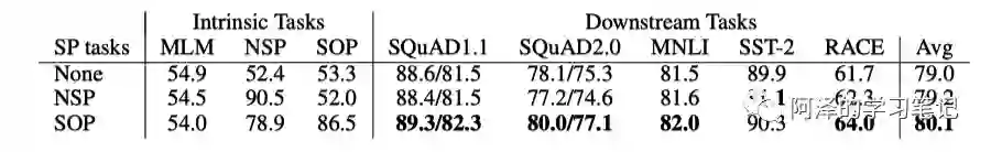 于是,作者对此进行改进,提出 Sentence order prediction(SOP),做法很简单,就是将原来预测的句子调换下顺序,sentence1 预测 sentence2 为正例,而 sentence2 预测 sentence1 为负例,这样就不用担心模型通过句子的主题而进行预测了。