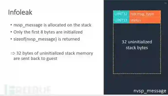这里用到一个信息泄露的漏洞,造成信息泄露漏洞的结构体是nvsp_message,它在栈上进行分配,它只初始化了前8个字节,却返回了sizeof(nvsp_message)大小,因此32字节未被初始化的栈内存会被发回给guest,造成信息泄露。通过泄露的信息,我们能够获得vmswitch的返回地址,进而构造rop链。