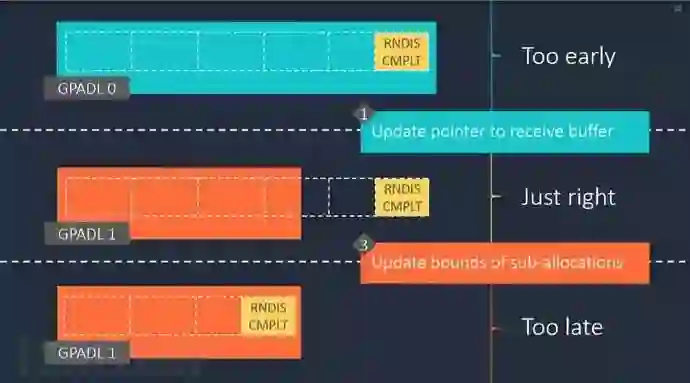 所以我们可以通过虚拟机传递给宿主机的 RNDIS 协议数据 使宿主机在处理数据后生成畸形的 cmplt 数据包。达到阻塞宿主机数据处理线程,造成延迟。 而后在N个畸形数据包后附加一个有效的并带有攻击载荷的cmplt数据包,使其在宿主机更新到新的应答内存过程中,指针已经偏移但子区分配表未更新时,写入越界内存。