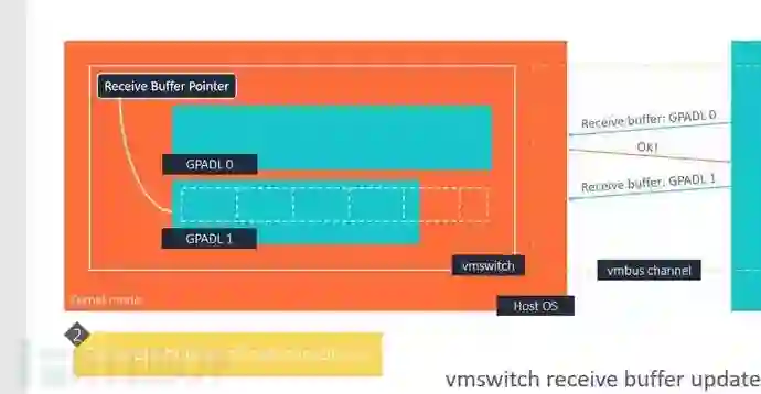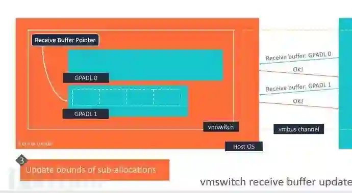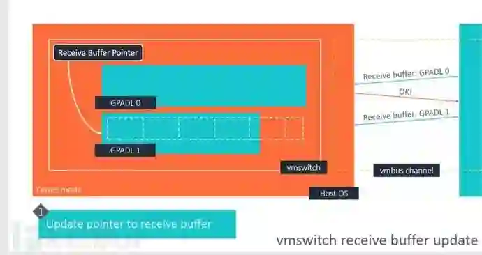 首先虚拟机发送GPADl通知内存地址指针,宿主机收到通知后更新内存指针,指到新的内存地址,但依旧保留这旧的子区分配表: