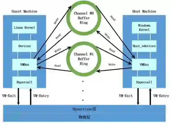 虚拟机与物理直接的数据交互通过环形内存的读写来完成。对环形内存的读写操作由VMBus来完成