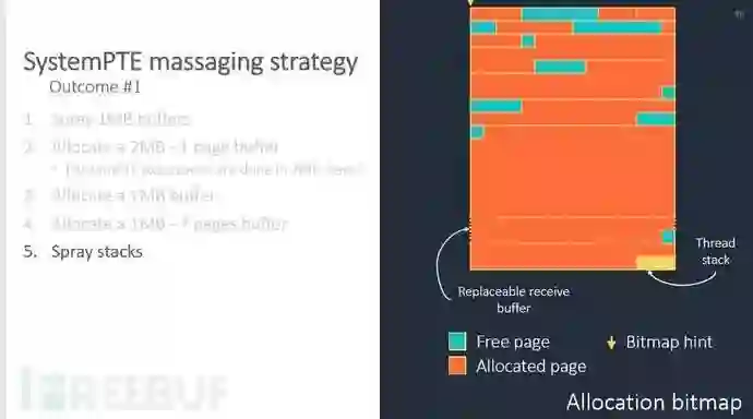 Jordan Rabet 在大会中做出进一步分析。MDL(表明虚拟内存缓冲区的物理页面布局)映射到物理内存,而这些MDL会被映射到SystemPTE区域。这个区域里通常存放的是其他的MDL以及内核栈。