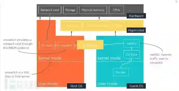 宿主机与虚拟机之间的数据传输通过VMBus(虚拟数据总线)实现,VMBus是微软开发的虚拟数据传输总线,用来宿主机和虚拟机之间交换数据和信息。使用VMBus的优点就是能进行快速、高效、大数据量的数据传输,极大的提升了虚拟机的性能。VMBus的原理和QEMU中的VirtIO设备类似,通过共享环形内存,每当要传输的数据写满整个环形内存时,就把数据发送到宿主机中。可以说,微软成功的借鉴了VirtIO设备的优点,取其优点用之,才会使得Hyper-V虚拟机性能大幅提升。