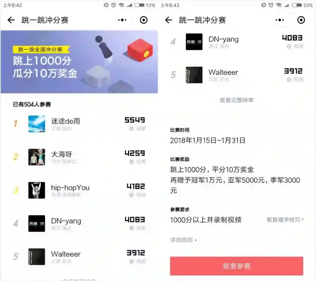 高手在民间,已经有超过 500 位,来自全国各地的千分大神们,参与到「跳一跳冲分赛」中了。目前最高分已经超过五千分!相信在比赛截止前,还会不断有高手来打破这个记录,一起拭目以待。