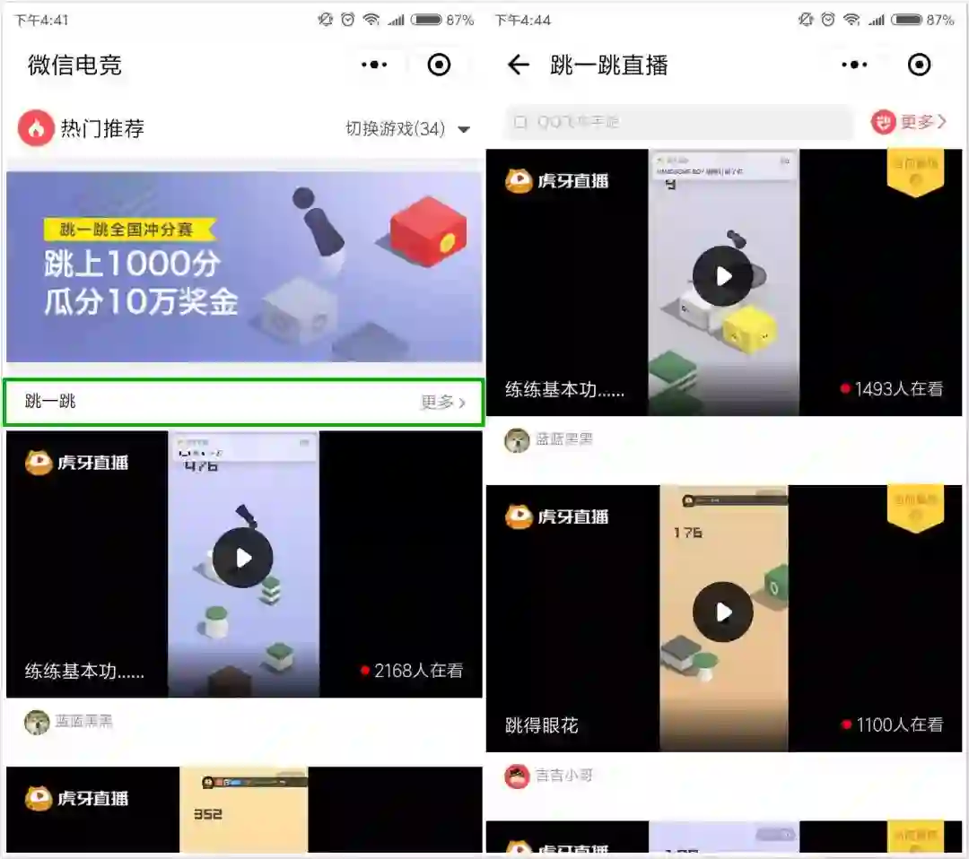 觉得一千分还遥不可及?那就先去小程序首页的「跳一跳」栏目,围观高手直播玩「跳一跳」吧。