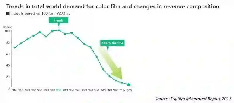 对于富士胶片来说,环境并没有更好,因为它面临着和柯达一样的风暴。富士胶片的总裁回忆道,“我们在预测中,无法解释的是数字化冲击的速度。胶片市场萎缩的速度比我们预期的要快得多。”
