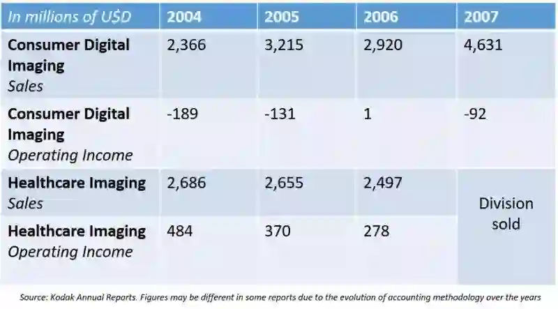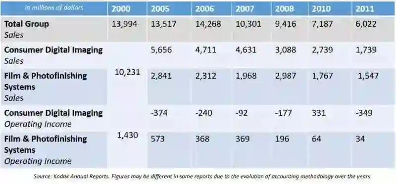 这个问题在财务报告中很明显。尽管2000年柯达的摄影部门有14亿美元的营业收入,但利润很快就消失了。