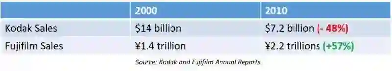 2000年,就在数字转型之前,与胶片相关的销售额占柯达收入的72%,占其营业收入的66%,富士胶片的比例则分别是60%和66%。