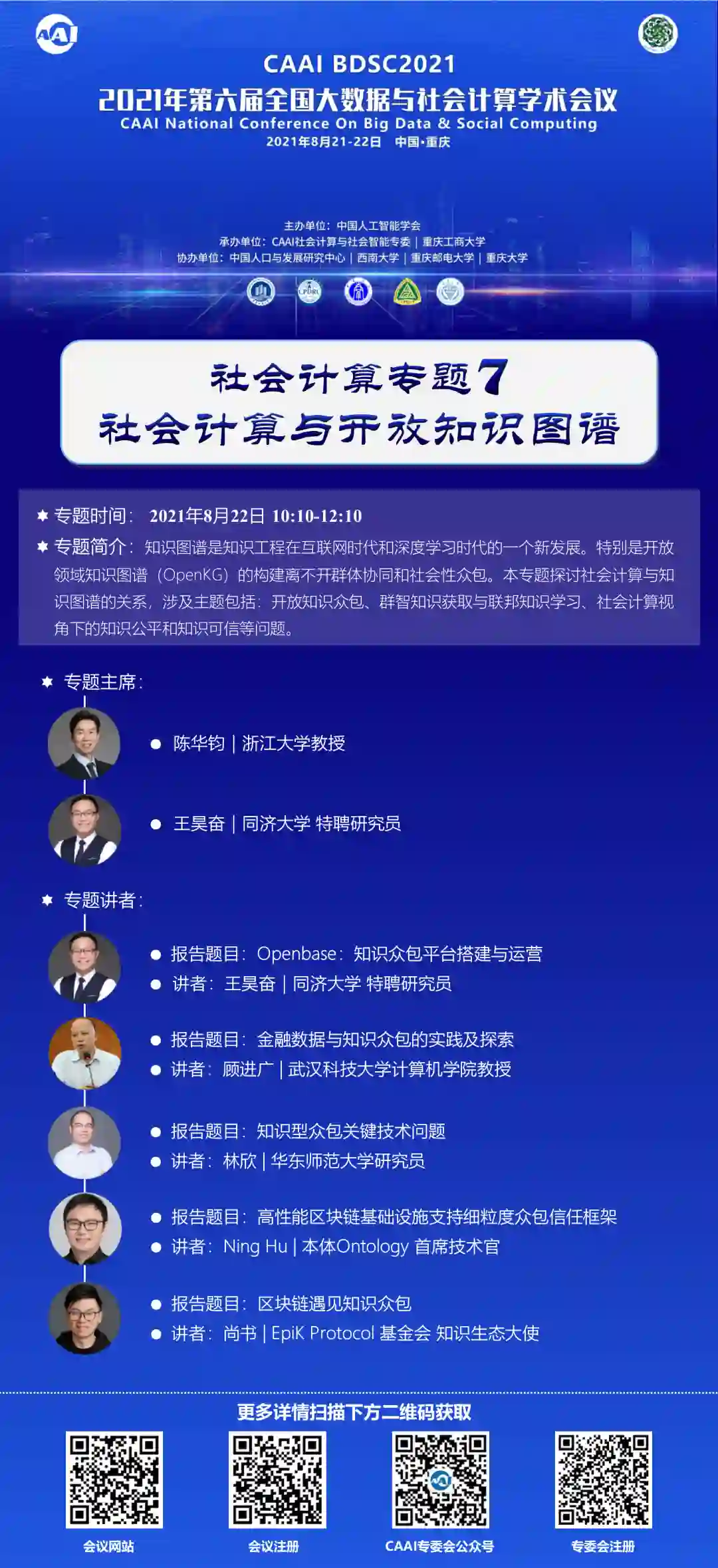 CAAI第六届全国大数据与社会计算学术会议(China National Conference on Big Data & Social Computing,简称BDSC)将于8月21-22日在重庆召开。