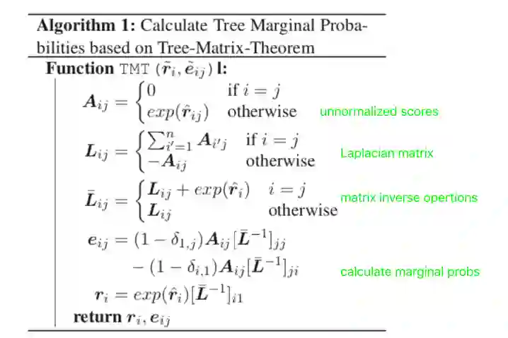 我们用树矩阵定理Tree-Matrix-Theorem (TMT; Koo et al. 2007; Tutte 1984) 计算根边缘概率 ri 和边边缘概率 eij (Liu和Lapata 2017)。TMT算法如下图所示: