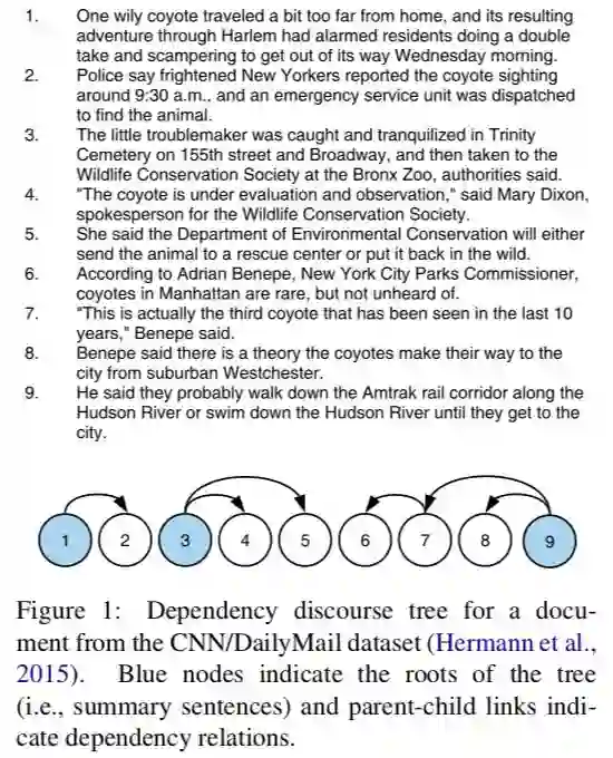 文档及其对应树的示例如图1所示;节点对应文档句子,蓝色节点表示应该在摘要中的句子,白色节点与其父摘要语句相关或包含。