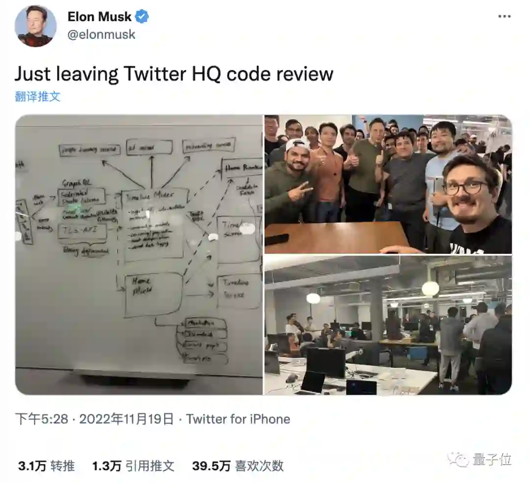 马斯克发推称“刚刚完成代码审查离开总部”,并晒出三张照片:讨论用的白板、最后的合影和讨论的过程。