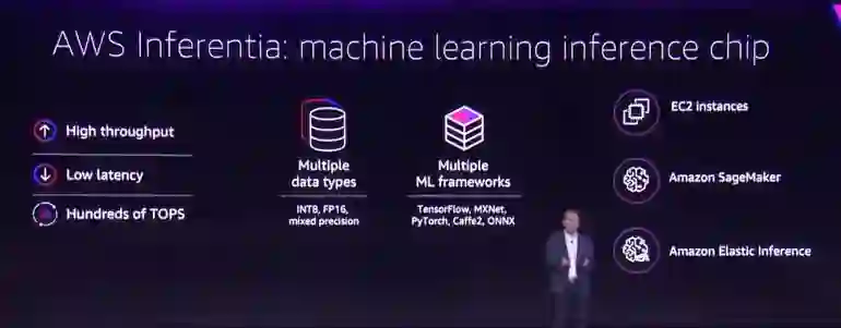 AWS Inferentia将支持主流深度学习框架,包括谷歌开发的TensorFlow、Facebook开发的PyTorch和MXNet等。当然,作为亚马逊自家的产品, Inferentia也支持EC2、SageMaker和最新的弹性推理引擎Elastic Inference。