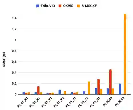 图2展示了比较结果。对于所有的方法均调整了参数使其尽可能表现最好。我们的Trifo-VIO 始终是表现最好方法的前两名。S-MSCKF的结果和我们的结果很接近,除了PI 3058,在这个数据集中,由于额外使用了线特征,我们的结果表现得更好。