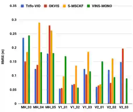 图1展示了评估结果,结果表明在MH04, MH05, V101和V201中Trifo-VIO是表现最好的方法。