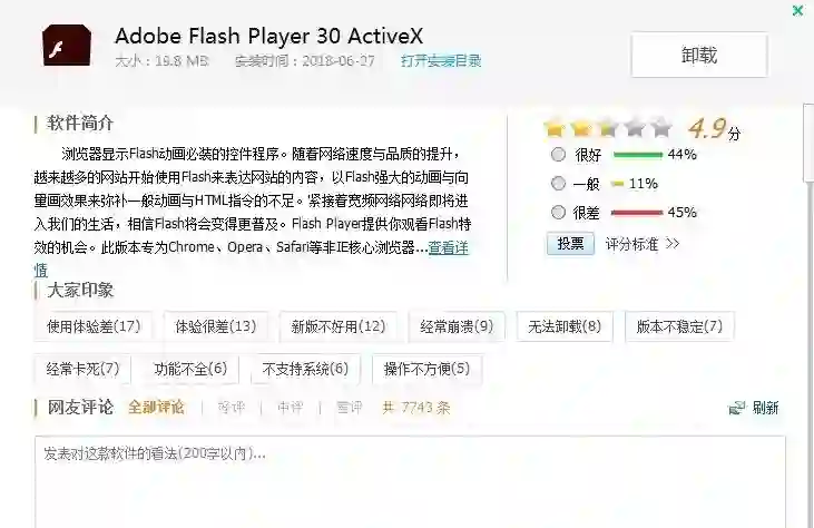Adobe Flash Player国内特供版是跟重庆一家名为重橙网络科技有限公司合作的,国内特供版安装后,电脑会常驻FlashHelperService服务,且常驻系统,不可关闭。