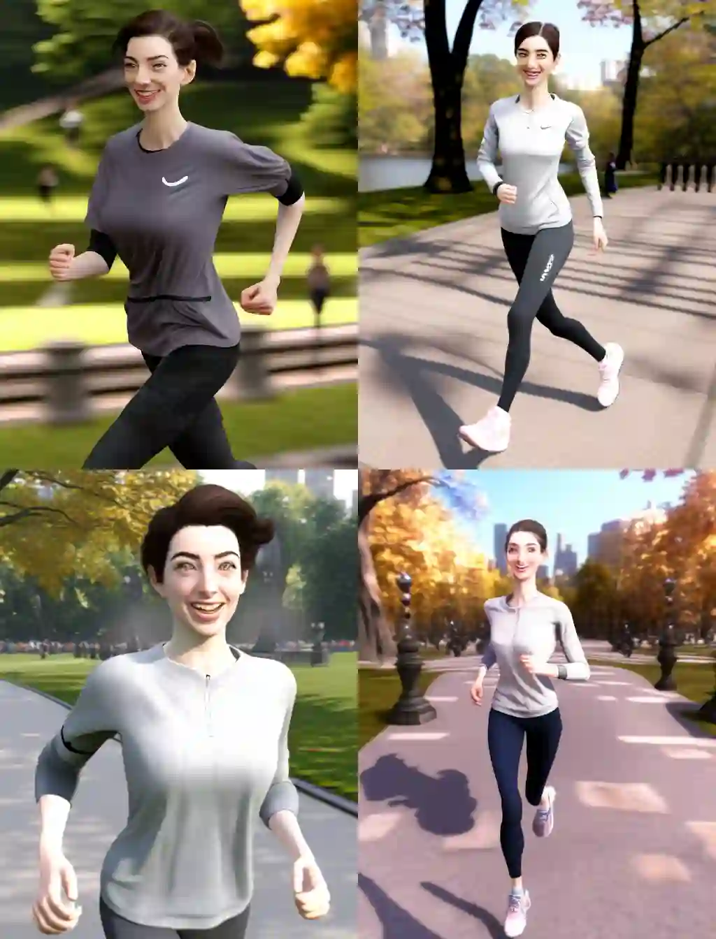 不过,在生成一些人物图时,我们可以看到明显的出入和瑕疵。比如「安妮海瑟薇开心地在跑步、沐浴在阳光下、穿着灰色的合身运动衫、黑色的打底裤、粉色跑步袜、白色跑步鞋、纽约中央公园、写实和超精细渲染风格、超写实油画……」。