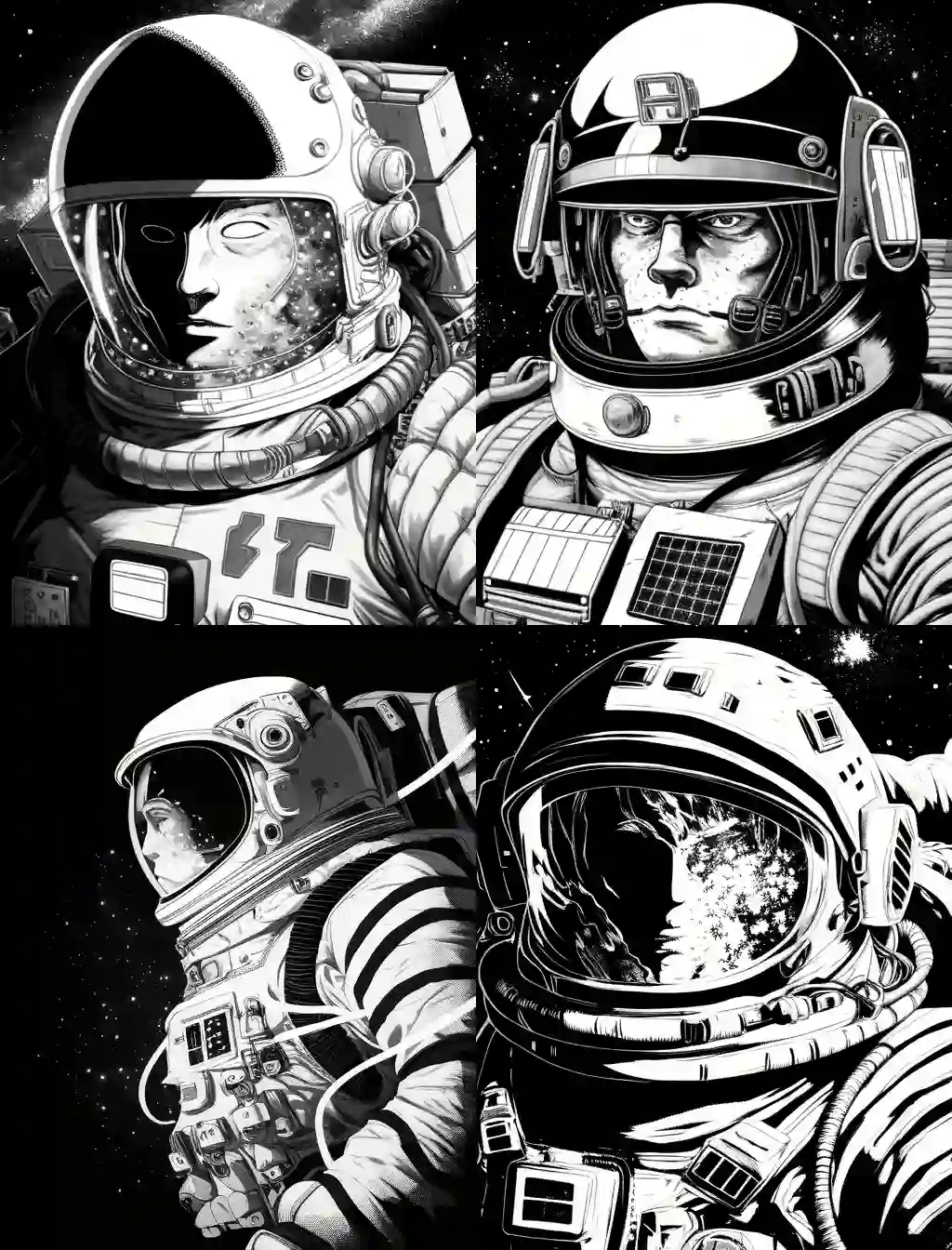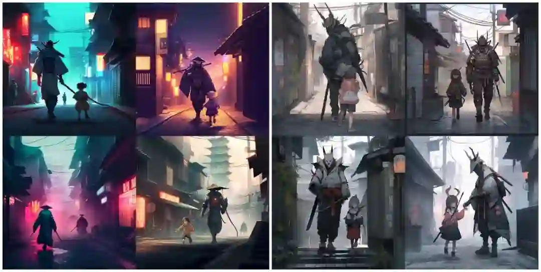 再比如「黑泽明电影中的宇航员战士,使用 Okumura Togyu 动画插图风格的黑白粗粒胶片人物肖像。」