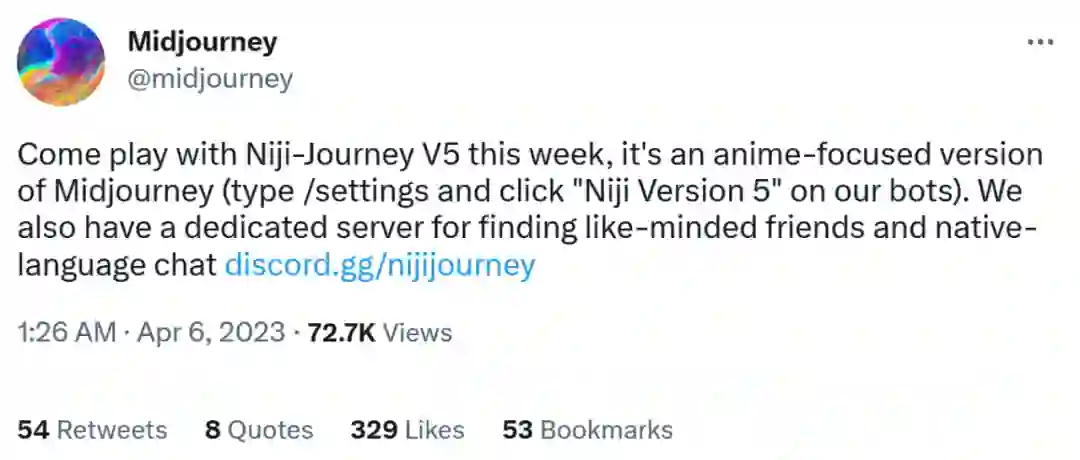 Midjourney 推出了 Niji-journey V5,它是一个针对二次元动漫的版本。Niji V5 支持了风格化(stylize)参数设置